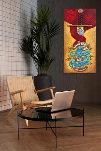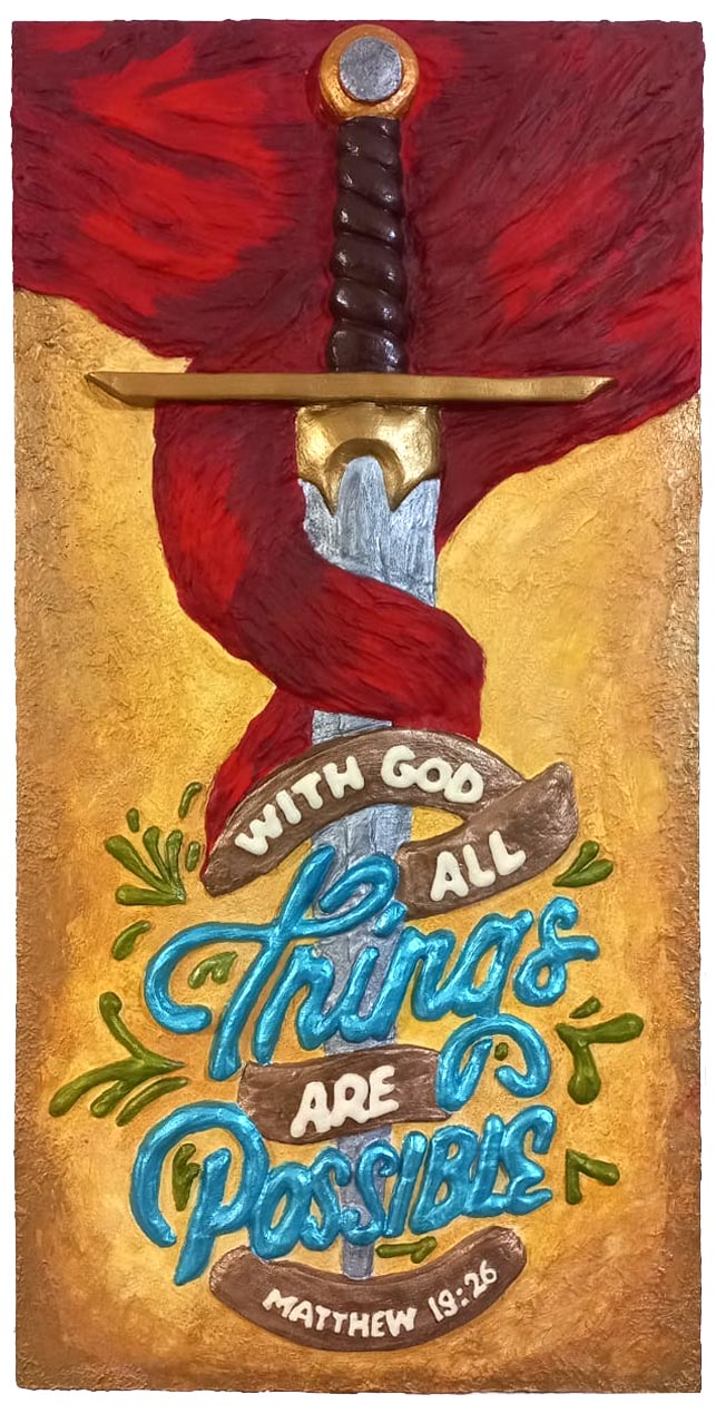 Este cuadro 3D en alto relieve está compuesto por una espada y un versículo biblico de Mateo 19:26 que dice que con Dios todas las cosas son posibles, esta promeda es inspiradora, sobre todo en momentos difíciles cuando nuestras fuerzas fallan, podemos confiar que las fuerzas de Dios nos sustenta para continuar.